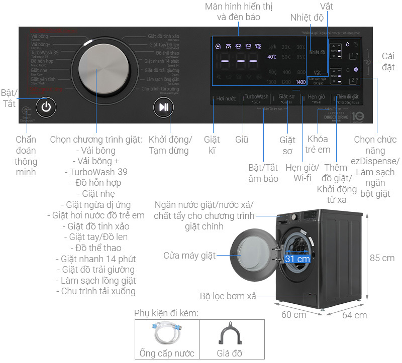- Tích hợp sẵn 14 chương trình giặt tiện lợi, bao gồm: TurboWash 39, vải bông, giặt ngừa dị ứng, giặt nhanh 14 phút, giặt nhẹ, đồ hỗn hợp, đồ tinh xảo,… Trong đó, chương trình giặt nhanh 14 phút chỉ phù hợp với những quần áo ít bẩn như vớ, tất, đồ thể thao,… và giặt với số lượng ít, giúp tiết kiệm thời gian.