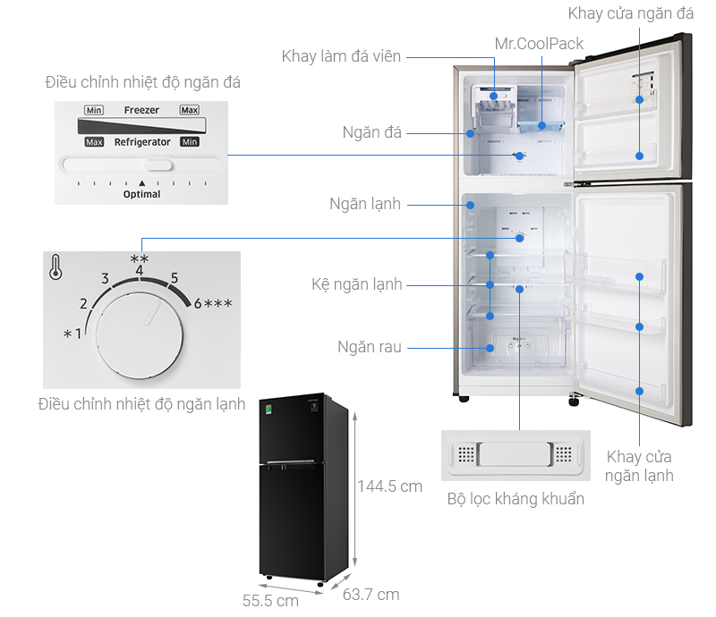 Tủ lạnh sở hữu kiểu dáng nhỏ gọn, vững chắc cùng với sắc đen sang trọng nổi bật trong không gian bếp của bạn. Thiết kế tủ lạnh Samsung ngăn đá trên truyền thống quen thuộc, tiện lợi cho quá trình sử dụng của bạn.